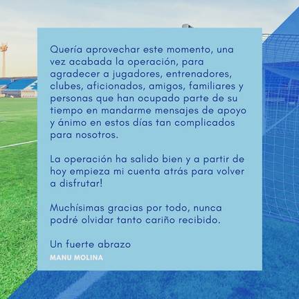 Todo ha ido bien. Manu Molina ha sido operado con éxito del tumor testicular que padece, según ha informado su actual club, la UD Ibiza. El futbolista onubense fue intervenido quirúrgicamente en las instalaciones de la clínica la Salud de Valencia y ahora iniciará el laborioso proceso de recuperación.