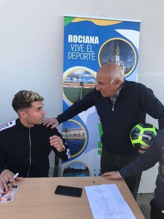 El extremo del Leganés ha visitado Rociana del Condado para, entre otras actividades, participar en un acto con los más pequeños. No faltaron las bromas, los toques de balón y colas interminables para conseguir un autógrafo del ídolo local.