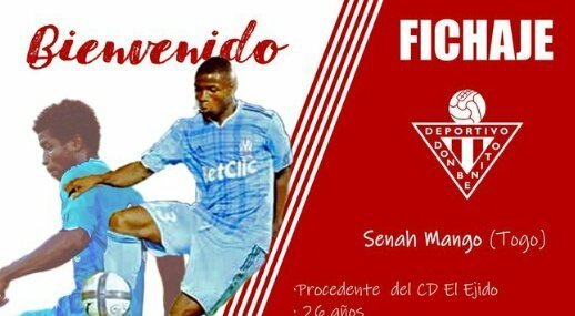SENAH MANGO: Defensa central nacido en Togo hace 26 años e internacional por su país. Mide 1,84 metros de alto y desembarca en el Don Benito procedente del CD El Ejido, con el que jugó 17 partidos el curso pasado. Su currículo incluye el Olympique de Marsella y el Mónaco.