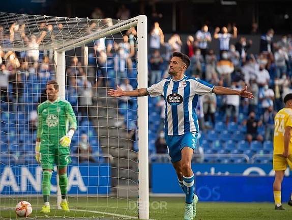 El mediapunta de Huelva marca el tanto del triunfo del Deportivo sobre el Badajoz en Riazor y ya es el máximo goleador de su equipo y el tercero de toda la Primera RFEF.