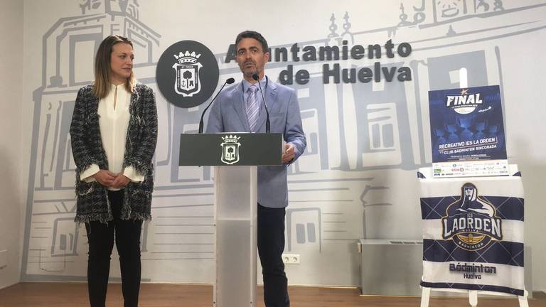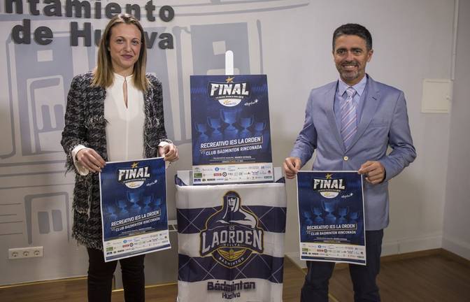 La concejala de Participación Ciudadana y Deportes, María José Pulido; y el director deportivo del Recreativo IES la Orden, Paco Ojeda, han presentado esta mañana la gran final de la Liga Nacional División de Honor de Bádminton, que enfrentará el próximo sábado al club onubense con el CB Rinconada de Sevilla, a las 17.30 horas, en el Andrés Estrada.