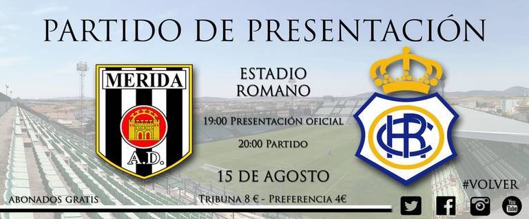 Una semana después, el 15 de agosto, el Decano visitará el Estadio Romano para participar en el partido de presentación del Mérida, que esta temporada competirá en Tercera División tras su descenso. Las entradas cuestan 8 euros (Tribuna) y 4 euros (General).