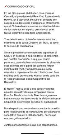 El Trust rechaza la oferta del Recre de ocupar dos asientos en el palco del Colombino