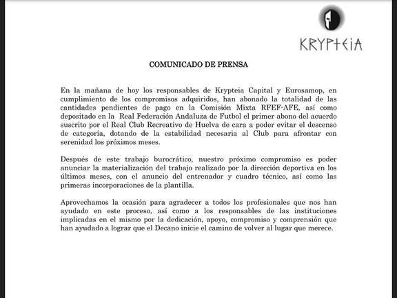Respecto a la deuda denunciada por los jugadores ante la Asociación de Futbolistas Españoles, tras presentar el Recre las pertinentes alegaciones, esta ha quedado reducida a unos 357.000 euros, según informa la misma emisora. De ellos, 297.000 euros corresponderían a las denuncias del primer plantel y 60.000 euros, al filial. Sobre las 15.00 horas, Kripteia ha emitido un comunicado oficial dando cuenta del pago.