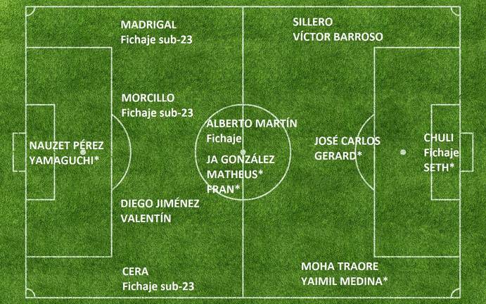 Cuando Nauzet Pérez y Yamaguchi levantan la mirada en los entrenos, únicamente están protegidos por Cera, Madrigal, Diego Jiménez, Morcillo, Jesús Valentín y Alberto Martín. Y sólo el puesto de central derecho está doblado, su bien, tanto Jiménez como Valentín se perfilan como titulares a poco que estén en forma. El resto de los integrantes de la plantilla son de corte ofensivo. Una circunstancia sorprendente a tenor de la fama de entrenador defensivo que arrastra Claudio Barragán.