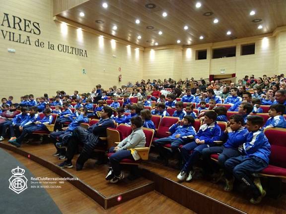 Nuevo esfuerzo de la Federación de Peñas y el Recreativo para extender el recreativismo por la provincia de Huelva. En esta ocasión, los afortunados fueron los 250 alumnos del CD Fútbol Base de Bonares, que disfrutaron de una charla-coloquio en el Teatro Cine Colón de la localidad.