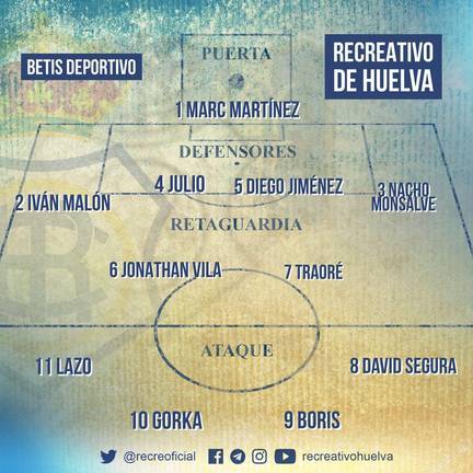 RECREATIVO: Marc Martínez; Iván Malón, Julio Rodríguez (Sergio González, min.46), Diego Jiménez, Nacho Monsalve (Carlos Calvo, min.76); Lazo, Jonathan Vila (Rafa de Vicente, min.63), Traoré, David Segura; Gorka Santamaría y Boris.