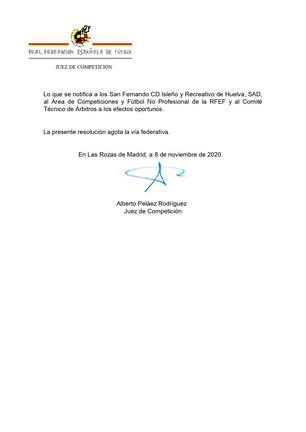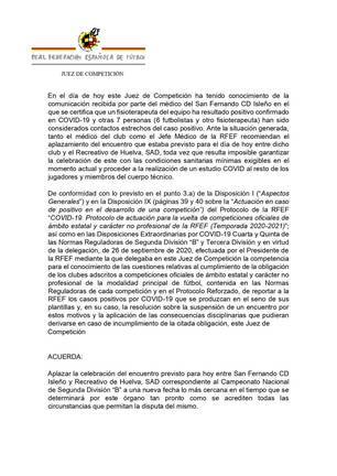 En la nota, el Juez Único de Competición aclara que la comunicación realizada por el médico del San Fernando sobre la existencia de un caso de coronavirus en su equipo, ha tenido lugar "en el día de hoy", certificando además que "un fisioterapeuta" ha dado "positivo confirmado en COVID-19", y que "otras siete personas (seis futbolistas y otro fisioterapeuta) han sido considerados contactos estrechos".
