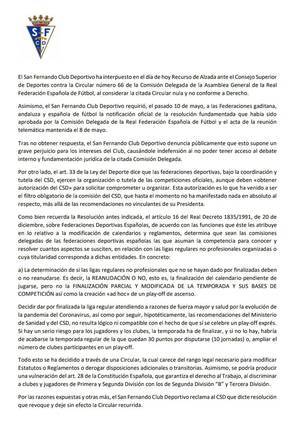 El San Fernando ha interpuesto hoy un recurso de alzada ante el Consejo Superior de Deportes contra la Circular Número 66 de la Comisión Delegada de la Asamblea General de la RFEF, por la que se ha cancelado la liga regular en la Segunda División B, sin descensos, pero disputándose un 'play-off' de ascenso 'express'.