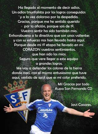 Javi Casares no continuará la próxima temporada en el San Fernando. Según ha comunicado oficialmente el club azulino, el jugador ha decidido ejercer el derecho estipulado en su contrato para no prorrogar por un año más su vinculación con el cuadro gaditano. Casares, de 33 años, disputó 30 partidos (22 como titular) este pasado curso, anotando 7 goles.