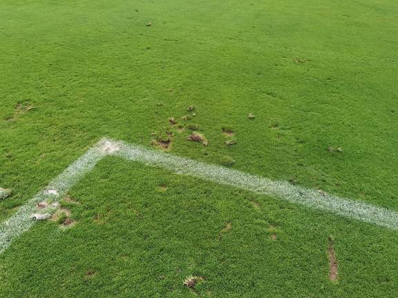 Esta tarde, el jardinero encargado del cuidado del césped del estadio aurinegro se ha encontrado con que alguien se había saltado al campo y jugado al fútbol sin el calzado adecuado, lo que ha provocado daños en la superficie. El club tiene tres días de plazo para arreglar el destrozo, pues el domingo hay partido de liga en Lepe.