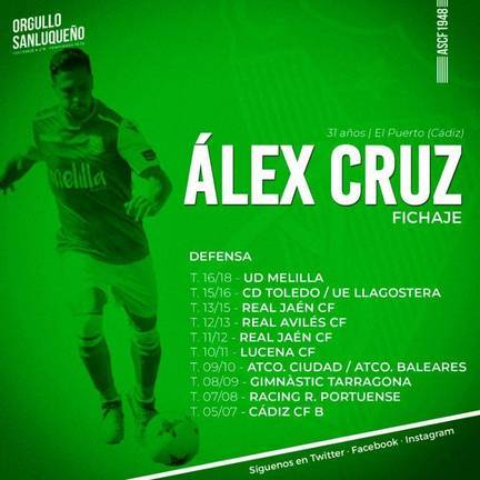 ÁLEX CRUZ (Mogán, Gran Canaria; 17/06/1990): Extremo derecho de 28 años y 1,65 metros de estatura. Ha jugado en Segunda División (63 partidos y 3 goles) y en todos los grupos de la Segunda División B (153 encuentros y 14 tantos). Procede del CD Ebro (18 partidos y 1 gol) y del CD Lealtad (13 y 2).