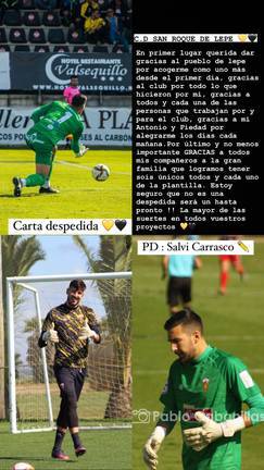 Cuando el pasado verano el San Roque de Lepe fichó a Salvi Carrasco, firmaba a un portero joven, de futuro y con cualidades para alcanzar el fútbol profesional. Buena prueba de ello es que ambas partes suscribieron un contrato por una temporada, ampliable a otras dos campañas. Sin embargo, el cancerbero no continuará vistiendo la aurinegra el curso venidero. De hecho, el propio jugador se ha despedido recientemente del club en las redes sociales con esta carta: