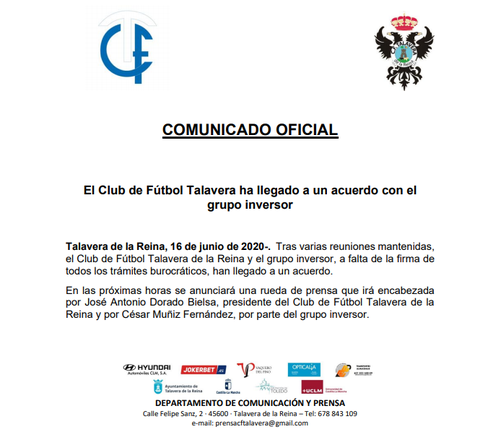 Del blanco al negro y del negro al blanco en apenas unos días. Tras aprobar su conversión en SAD y anunciar que no había logrado un acuerdo con el grupo inversor, el Talavera ha emitido un nuevo comunicado dando cuenta ahora del pacto alcanzado con los mismos inversores. Si la operación cristaliza finalmente, el conjunto manchego será un duro rival para el Recreativo de Huelva en la próxima temporada.