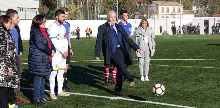 El entrenador salmantino ha recibido el obsequio de manos de Roberto Sánchez, consejero del Recreativo de Huelva, con ocasión de la IV Gala Figura Mítica del Fútbol que se ha celebrado en Minas de Riotinto. Es el reconocimiento del Decano a la dilatada y exitosa carrera profesional de Vicente del Bosque.
