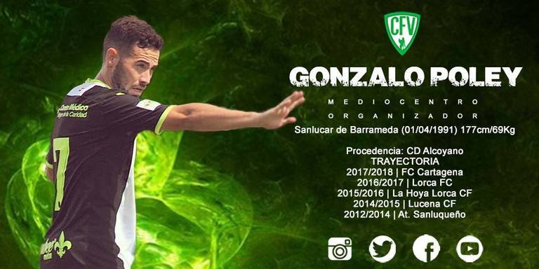 GONZALO POLEY (Sanlúcar de Barrameda, Cádiz; 01/04/1991): Mediocentro organizador de 27 años, proviene del CD Alcoyano. Posee calidad, visión de juego y golpeo de balón. Pasó por la cantera del Real Madrid, para luego jugar en el filial del Málaga, Atlético Sanluqueño, Lucena, Lorca y Cartagena. Suma más de 180 partidos en la Segunda División B.