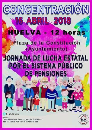 La Plataforma onubense en defensa de las pensiones públicas convoca una nueva concentración en Huelva para hoy lunes 16 a las 12:00 en el Ayuntamiento de Huelva contra la subida de las pensiones del 0,25% aplicada para el actual 2018 y consagrada en el proyecto de ley de Presupuestos Generales del Estado recientemente aprobado por el gobierno del Partido Popular y en tramitación en las Cortes Generales, en denuncia de una propuesta de reglamento para un producto paneuropeo de pensiones individuales (PEPP) que promueve la Comisión Europea (CE), y por el conjunto de sus reivindicaciones.