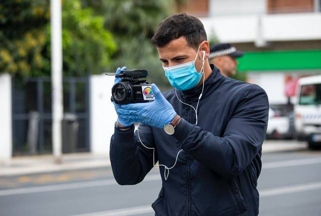 Y al igual que los sanitarios, si hay un sector que estos días se encuentra más activo que nunca, es el de los medios de comunicación. El reportero de WiHu TV y diariodehuelva.es sigue a pie de calle toda la actualidad del coronavirus en la provincia de Huelva.