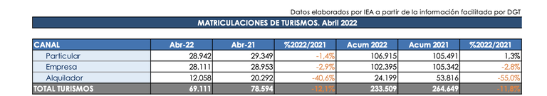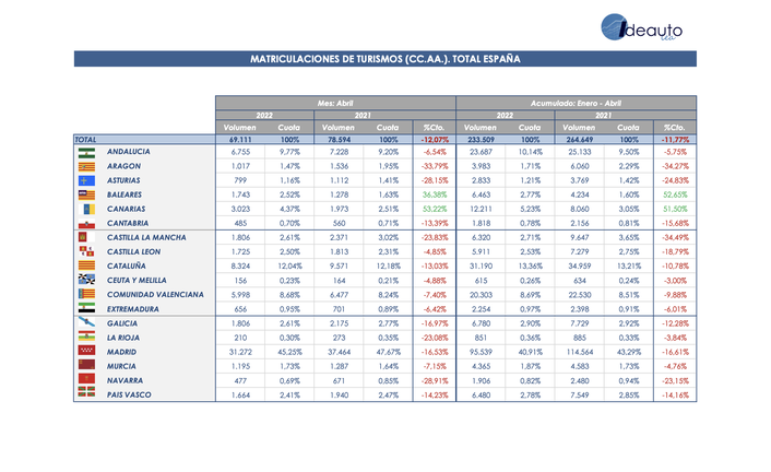 Las matriculaciones de turismos y todoterrenos registran un retroceso del 12,1% en abril en comparación con el mismo mes del año anterior, con un total de 69.111 unidades. La crisis de los microchips junto con la lenta recuperación económica, ahora acentuada por la incertidumbre derivada del contexto internacional, están siendo factores fundamentales para la evolución de la demanda de vehículos nuevos. En los cuatro primeros meses, ya se acumula una caída del 11,8%, con 233.509 unidades.