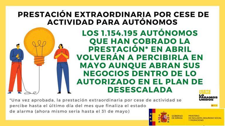 Los autónomos beneficiarios de la prestación que puedan abrir su negocio al inicio de la desescalada seguirán percibiéndola hasta el último día del mes que finalice el estado de alarma (ahora mismo hasta el 31 de mayo). La ayuda busca proteger la falta de ingresos de los autónomos en esta situación excepcional y contribuir a la supervivencia de su negocio.