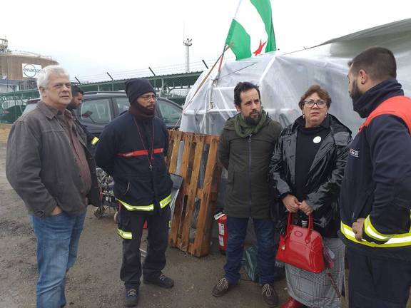Mónica Rossi y Jesús Amador, integrantes del Grupo Municipal de Adelante en el Ayuntamiento de Huelva, han participado hoy en una asamblea organizada por el Sindicato Unitario a las puertas de la planta de Enagás en Palos de la Frontera donde han trasladado “todo nuestro apoyo” a los bomberos que mantienen desde hace doce días una huelga indefinida. Rossi y Amador comparten “totalmente” las reivindicaciones de este colectivo que reclaman la readmisión de su representante sindical, Darío Segade, despedido injustamente, así como la reincorporación a sus puestos a los trabajadores que han sido degradados en represalia por sus reivindicaciones laborales, unas condiciones de trabajo dignas y que las empresa les provea de uniformes y equipos adecuados para realizar su trabajo en condiciones de seguridad.