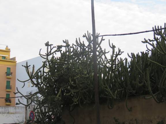 - En la Calle Aragón encontramos que los cactus tubulares que están pegados a un muro, los cuales crecen en las laderas del Cabezo de San Pedro, están a punto de caer una línea de cables, aparte de que en esa zona está prohibido el paso por el acerado por la misma razón, pareciéndonos muy raro que no se haya actuado aún.
