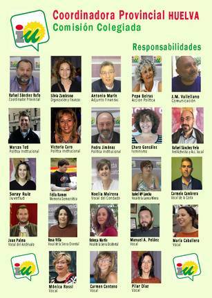 Con Rafael Sánchez Rufo al frente, la nueva dirección provincial de IU se completa con Silvia Zambrano, proveniente del movimiento sindical y feminista onubense, como Responsable de Organización y Finanzas; Antonio Marín, ex alcalde de Cortegana, como Adjunto de Finanzas; Pepa Beiras, como Responsable de Acción Política, al mismo tiempo que coordina el Área Andaluza de Medio Ambiente de IU y forma parte de Coordinadora Federal de IU. A ellas se suman Juan Manuel Vallellano como Responsable de Comunicación, y Rafael Sánchez Velo, Secretario Provincial del PCA, como Responsable de Red de Activistas y Acción Social.