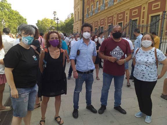 Integrantes de Izquierda Unida de Huelva han participado hoy en una movilización de alcaldes, concejales y concejalas de la organización que se han concentrado ante la sede del gobierno andaluz, en el Palacio de San Telmo (Sevilla), por los recortes al Plan Aire con los que el ejecutivo de Moreno Bonilla han dejado a los planes de empleo para los municipios andaluces con 113 millones de euros menos.