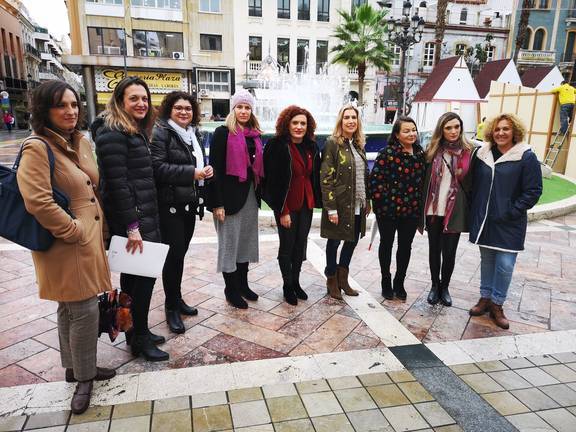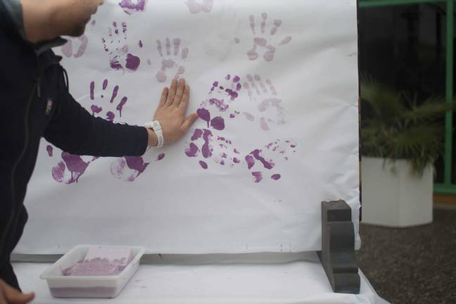 El equipo de voluntariado de la Fundación Cepaim que trabaja con inmigrantes en Huelva, ha creado un photocall feminista para que todo el mundo pueda dejar su huella morada durante todo el día.