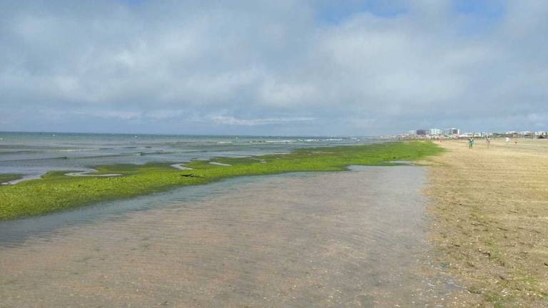 La invasión comenzó hace unos días en el litoral ayamontino, sobre todo en Punta del Moral, y ya se extiende hasta Punta Umbría. Grandes zonas de esta concurrida playa está repletas de este verdín que suele aparecer en esta época veraniega.