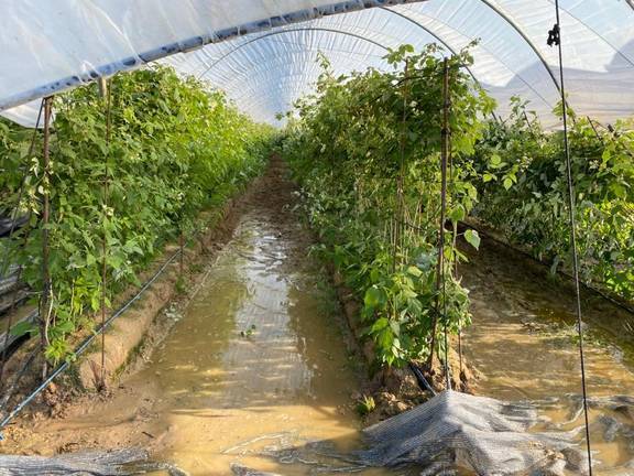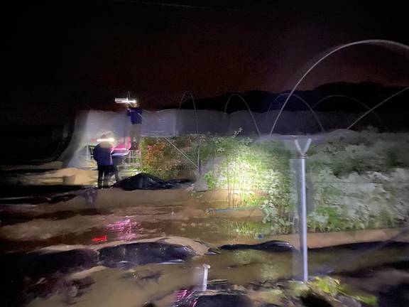 Un total de seis explotaciones han registrado daños, no solo por las fuertes lluvias registradas, sino también por la una especie de tornado que ha entrado por el municipio de Bonares y que ha tenido más graves consecuencias en la zona de La Palma del Condado y Almonte, con plásticos rotos, arcos doblados, túneles encharcados y plantas tumbadas.