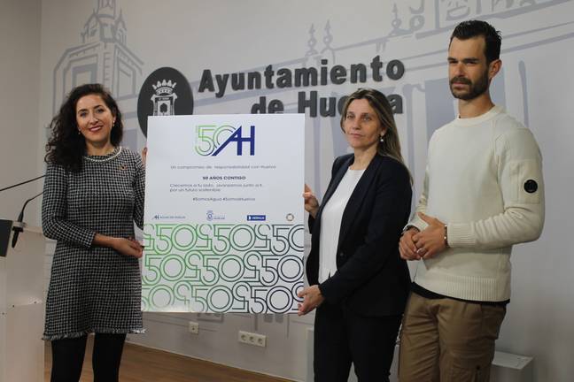 La primera teniente de alcalde de Economía, Presidencia y Relaciones Institucionales del Ayuntamiento y presidenta de Aguas de Huelva, María Villadeamigo, acompañada de Isabel Butrón, directora gerente de la empresa, han presentado el logotipo y esbozado el programa de actos organizado para celebrar el 50 aniversario de Aguas de Huelva, animando a los onubenses “a participar e involucrarse en la celebración de estas bodas de oro, porque los onubenses son el alma y la razón de ser de esta señera empresa”.