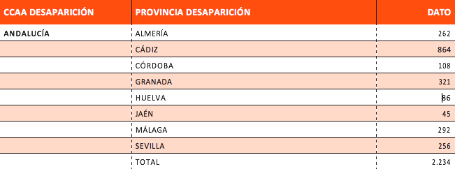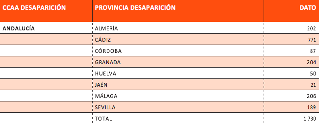 Jaén es la provincia en la que menos casos se han denunciado con 21, seguida de Huelva con 50 y Córdoba, 87. Datos muy preocupantes los de Cádiz que de 864 casos registrados, 771 son menores desaparecidos. Le siguen Málaga (206), Granada (204), Almería (202) y Sevilla (189).