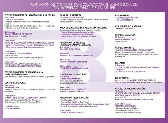 - 25 abril: XX Encuentro Provincial de Asociaciones de Mujeres; mientras que la VIII Escuela de Igualdad.