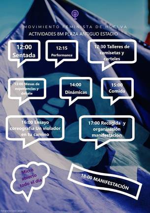 - 8 de marzo: Manifestación desde la plaza del Estadio Colombino antiguo, a las 18 horas. Durante el día se realizarán diferentes actividades como charlas, talleres de decoración de camisetas, performance...
