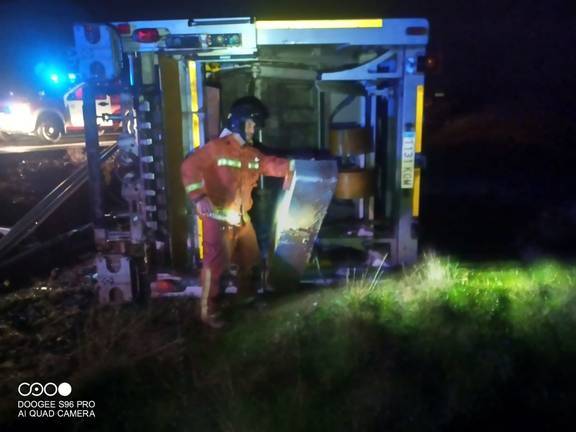 Según el Consorcio de Bomberos, a las 4:30 de esta madrugada recibieron el aviso del vuelco de un camión de basura en Tharsis. Un accidente que deja dos heridos.