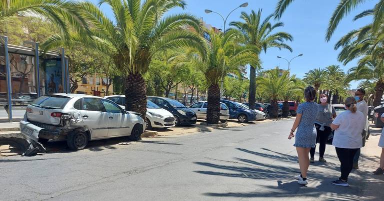 El vehículo impactado, un Seat Ibiza, ha quedado maltrecho en el aparcamiento sin que por el momento haya noticias del conductor que impactó contra él. Tiene multitud de daños en la parte trasera y en la delantera, que quedó destrozada al empotarse contra la palmera que tenía delante.