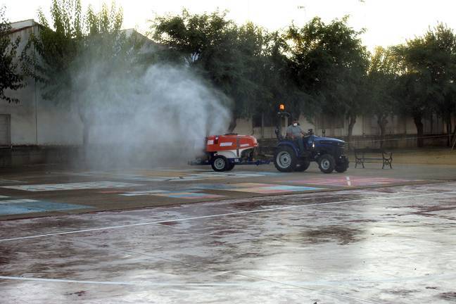 En el caso de esta nueva batida, el Consistorio aporta el material para la desinfección y el agricultor que colabora con la iniciativa pone a su disposición la maquinaria especial de fumigación con la que cuenta, que por sus características específicas, es idónea para la realización de estas tareas. “Esto nos permite – señala González Bayo-, reforzar la desinfección y limpieza diaria que realiza en el entorno de los centros la empresa adjudicataria del servicio de limpieza viaria, OHL”.