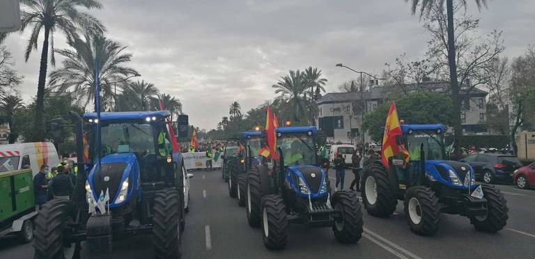 Bajo el lema ‘La agricultura y la ganadería, una cuestión de Estado’, los miles de manifestantes, llegados de cada una de las provincias andaluzas, y todos ellos profesionales de la agricultura, la ganadería, representantes de cooperativas y de empresas de servicios, han partido desde la explanada del Estadio Benito Villamarín y ha recorrido la Avenida de la Palmera con destino a la sede de la Delegación del Gobierno de Andalucía.