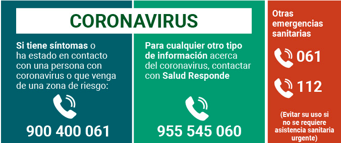 Se ha puesto en marcha la línea de información sobre el coronavirus con el número 900 40 00 61 que está disponible 24 horas al día. Se recomienda llamar si se presentan síntomas o ha estado en contacto con una persona con coronavirus, o que venga de una zona de riesgo. Para cualquier otro tipo de información sobre coronavirus debe contactar con Salud Responde en el 955 54 50 60.