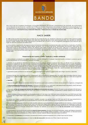 El Ayuntamiento de Almonte ha emitido un bando con motivo de la próxima celebración de la Función Principal y el Traslado de la Virgen del Rocío 2022. El objetivo de este documento es garantizar la seguridad de los vecinos y visitantes que acudan durante estas jornadas festivas.