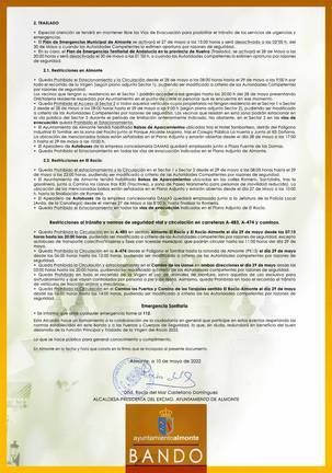 En el caso del Traslado, el bando distingue entre las restricciones de Almonte y las de El Rocío, igualmente se establece un Sector 1 para el recorrido de la Virgen y un Sector 2 para las zonas aledañas.