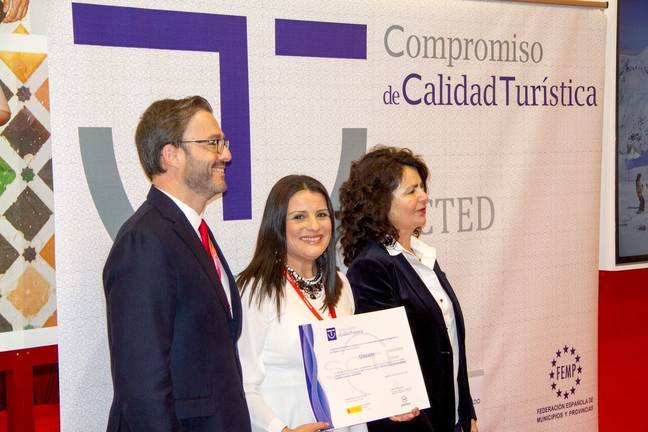 La jornada de este viernes en Fitur para el Ayuntamiento de Almonte comenzó con la recogida del Diploma Sicted, el Sistema Integral de Calidad Turística en Destino, un proyecto de mejora de la calidad de los destinos turísticos promovido por la Secretaria de Estado de Turismo y la Consejería de Turismo y Deporte de la Junta de Andalucía que otorga un valor añadido a los servicios y empresas turísticas del municipio y reconoce la excelencia de este destino, al tiempo que permite posicionarlo con ventaja frente a otros destinos turísticos españoles que no cuentan con él. La encargada de recoger el diploma ha sido la alcaldesa, quien ha destacado la importancia de este reconocimiento para “seguir avanzando en el desarrollo turístico sostenible de nuestro municipio”.
