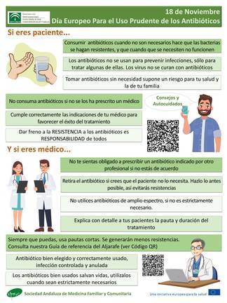 Esta iniciativa, con la que ambos distritos del Servicio Andaluz de Salud (SAS) se adhieren a la conmemoración esta semana del Día Europeo para el Uso Prudente de los Antibióticos promovido por el Centro Europeo para la Prevención y Control de Enfermedades (ECDC según sus siglas en inglés), consta de diferentes actividades. Entre ellas se encuentran el desarrollo de una campaña informativa que incluye la distribución en los centros de salud de sus respectivas áreas de influencia de dípticos y un cartel elaborado para la ocasión con mensajes claros y directos acerca del consumo y la prescripción de estos fármacos, así como la organización de sesiones formativas abiertas a la ciudadanía y la difusión de protocolos y pautas de actuación dirigidas al personal médico.