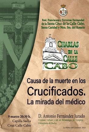 El prestigioso doctor y cofrade Antonio Fernández Jurado, pronunciará el próximo miércoles 9 de marzo, a las 20:30 horas, una interesante conferencia en La Palma del Condado, dentro de las "Charlas de la calle Cabo", organizado por la Real, Franciscana y Fervorosa hermandad de la Santa Cruz de la Calle Cabo, teniendo como escenario la Capilla Santa de la citada hermandad, y donde el orador onubense versará sobre "La causa de la muerte en los crucificados" La mirada del médico.
