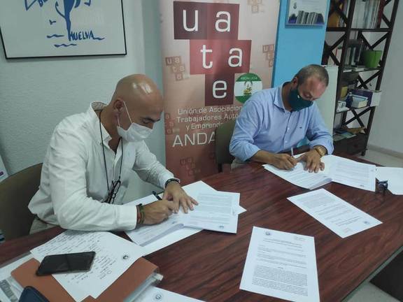 La Unión de Autónomos UATAE-ANDALUCÍA ha firmado la adhesión a las peticiones de la Plataforma para la llegada de la línea de Alta Velocidad a Huelva, en un acto en el que han participado el Secretario General de los autónomos andaluces, Pepe Galván, y el representante de la plataforma, Salvador Romero Pablos.