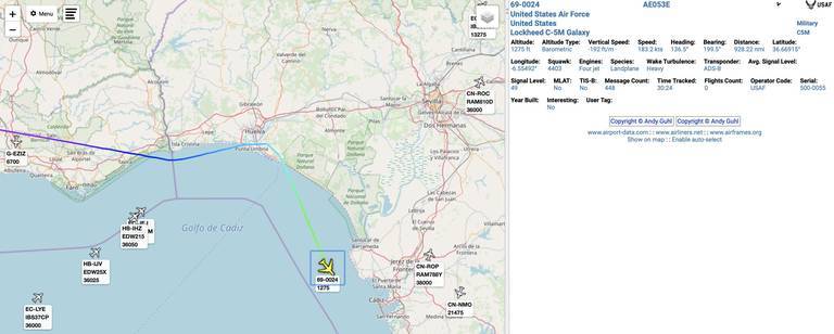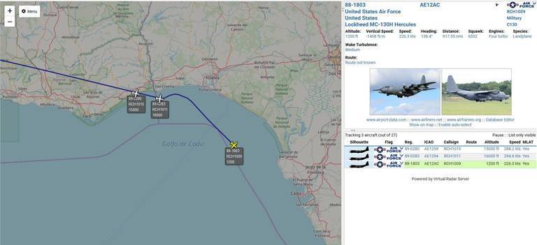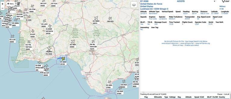 Es el caso de un carguero C-5M Galaxy de la USAF, que como ha venido rastreando PT_Mil_Civ_Radar, atravesó Huelva a la altura de Punta Umbría. También han sido identificados frente a Isla Cristina, tres MC-130H Combat Talon, aparatos empleados para apoyar o realizar operaciones especiales.