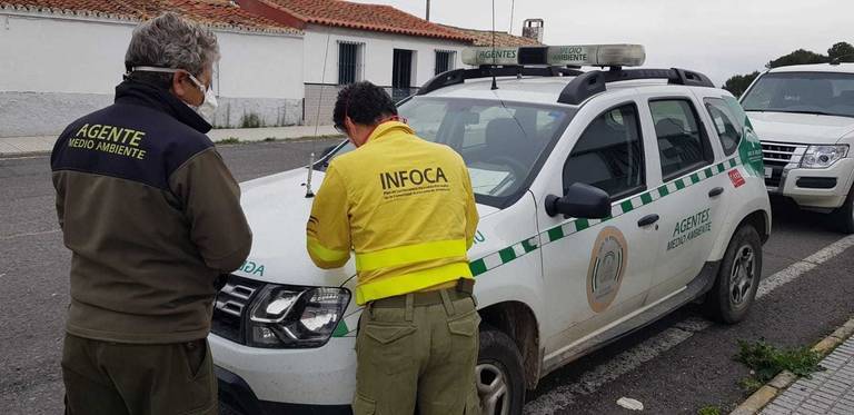 Al amplio contingente humano del Infoca desplegado hoy para contribuir contra el coronavirus en Andalucía, se suman más de cien vehículos, de los que 30 son para la desinfección (autobombas con 4.500 litros de capacidad y ‘pick up’ con 550 litros) y el resto todoterrenos destinados al transporte del personal interviniente. Cobra una especial importancia en las tareas encomendadas la figura del ‘manos limpias’, trabajador aséptico que solo atiende a los bomberos forestales secando el sudor, desempañando las gafas protectoras o cualquier otra necesidad que se presente en el transcurso de los trabajos.