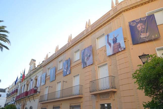 La fachada del edificio consistorial y la de la Casa Grande de Ayamonte acogen desde este miércoles las fotografías en grandes dimensiones de algunas de las imágenes de la Semana Grande de la ciudad, que forman parte de la exposición “EGO SUM VIA, VERITAS ET VITA”, “Yo soy el camino, la verdad y la vida”, organizada por el Ayuntamiento y la Agrupación de Cofradías y Hermandades de la Semana Santa ayamontina.
