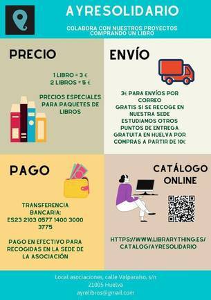 Regularmente se irán ofreciendo en las redes de Ayre Solidario (Facebook, Twitter, Instagram) lotes o títulos sueltos de libros. Las personas interesadas pueden solicitar los que le interesen a ayrelibros@gmail.com. Los libros serán enviados con un pequeño coste de envío o podrán recogerse en la sede, en la calle Valparaíso, s/n (frente al nº 18), de Huelva. En función del número de libros comprados se valorarán otras direcciones de entrega en Huelva.